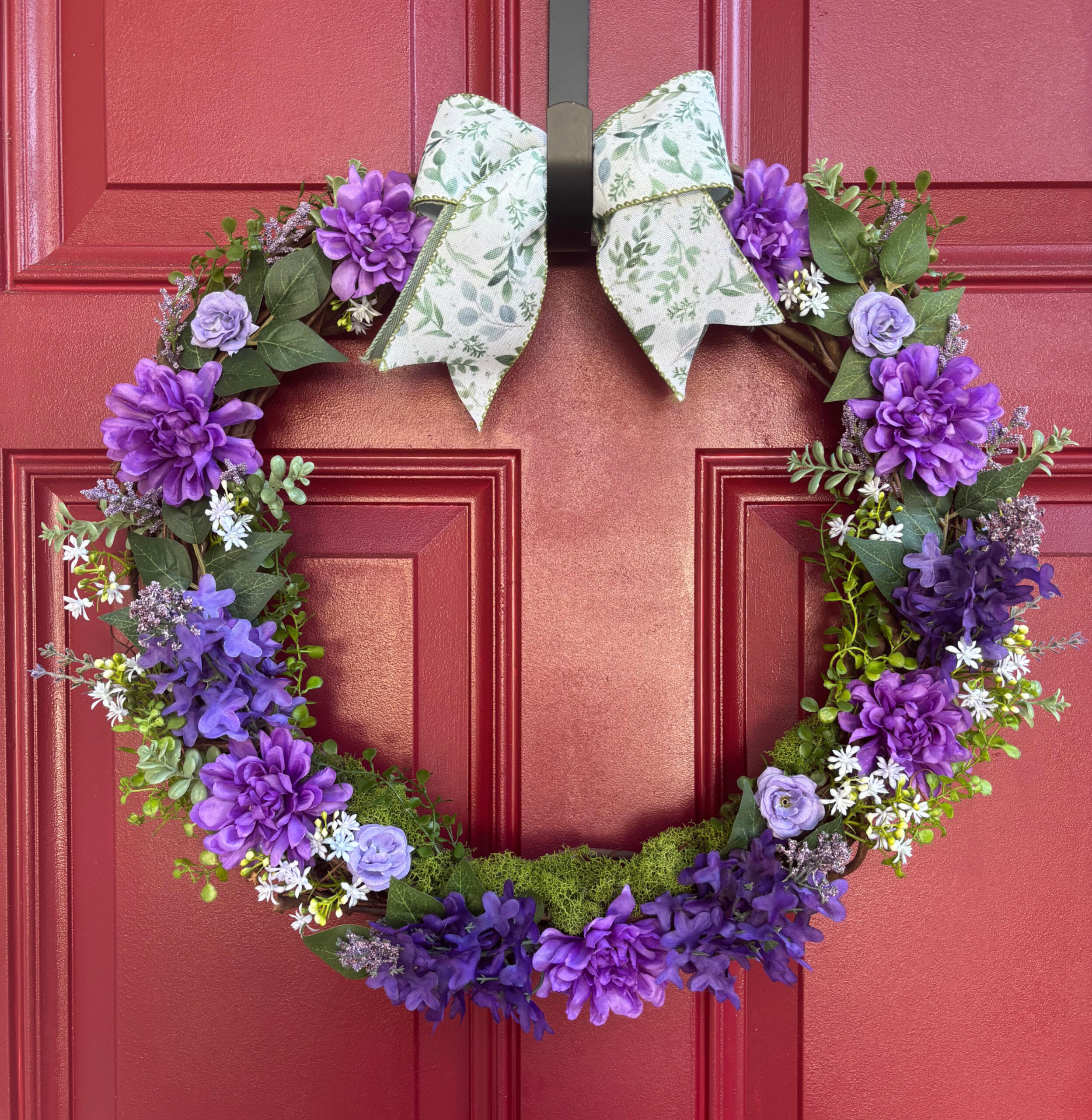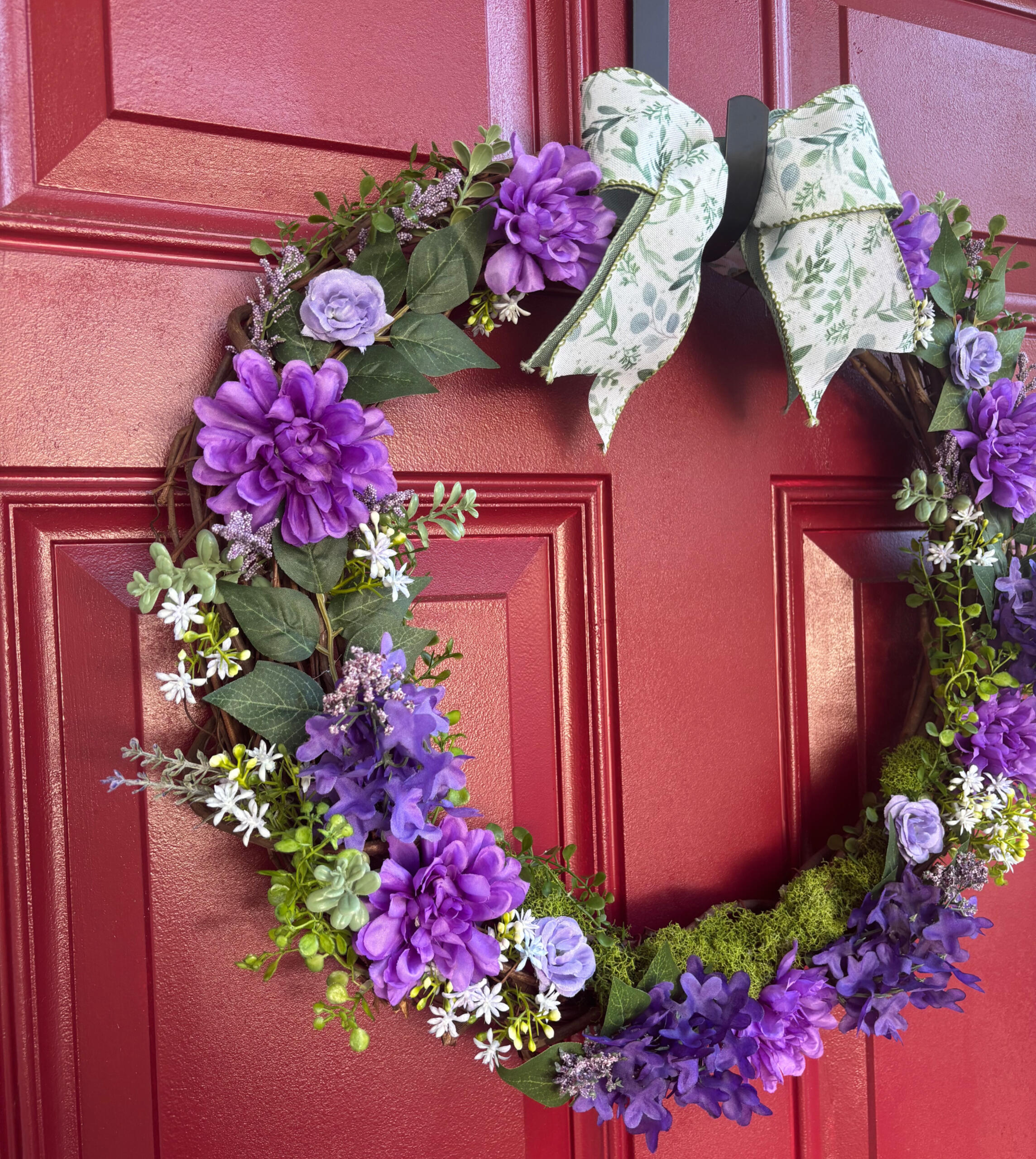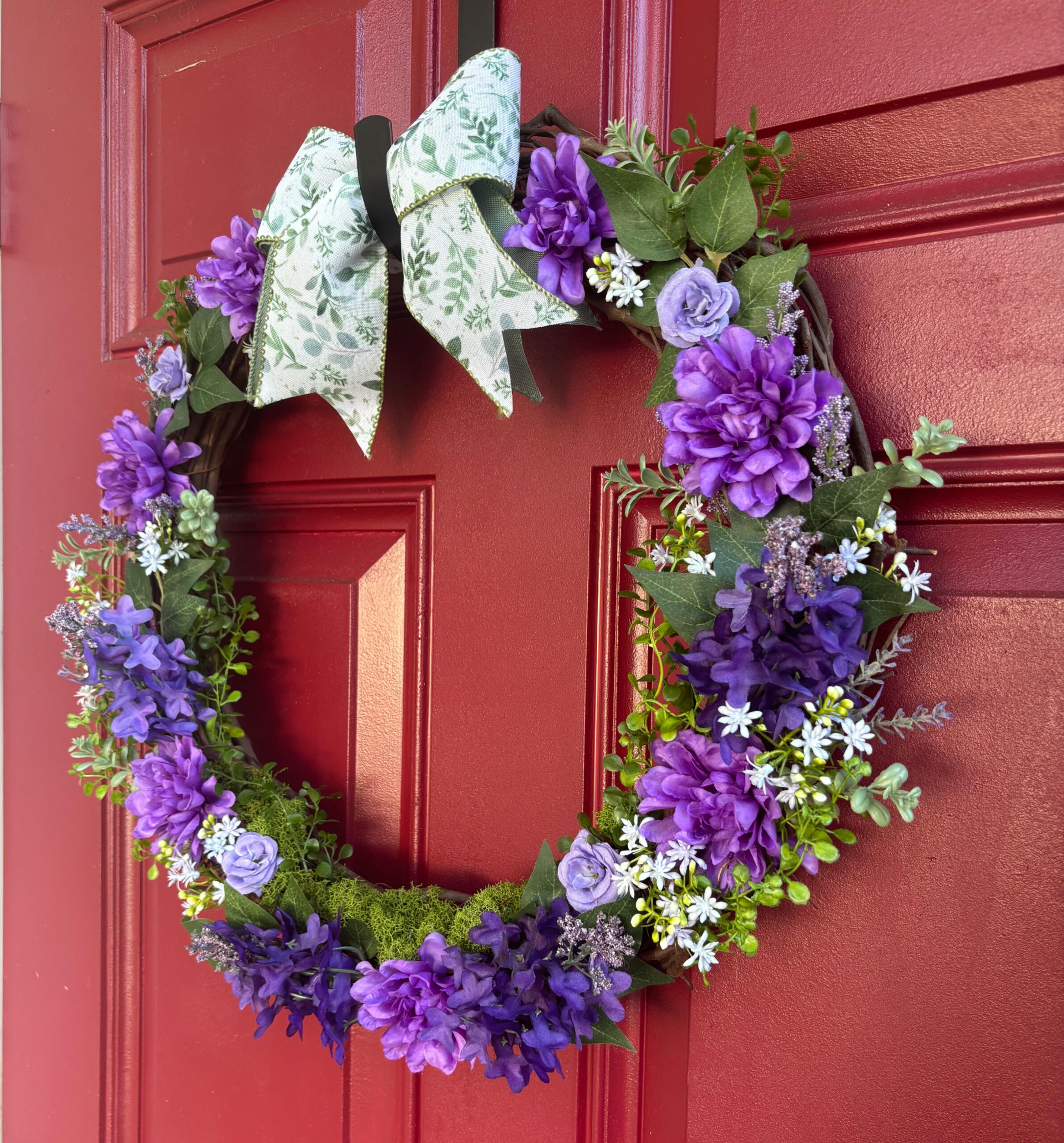 As summer fades into autumn, this 18” handcrafted wreath captures the soft transition with lush purples, trailing greenery, and a mossy base. Hints of lavender and a botanical bow evoke the feel of a woodland clearing at dusk.
